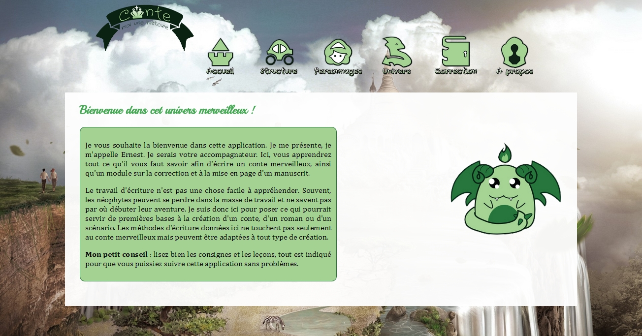 Cette charte graphique a été réalisée dans le cadre de ma troisième année de licence en Sciences du langage, de l'information et de la communication. Le but était de créer un objet pédagogique interactif. Le sujet était le suivant : l'écriture d'un conte merveilleux. Cette charte graphique comprend la création de la mascotte et des logos déclinés sous trois couleurs, ainsi que les icônes de la navigation.